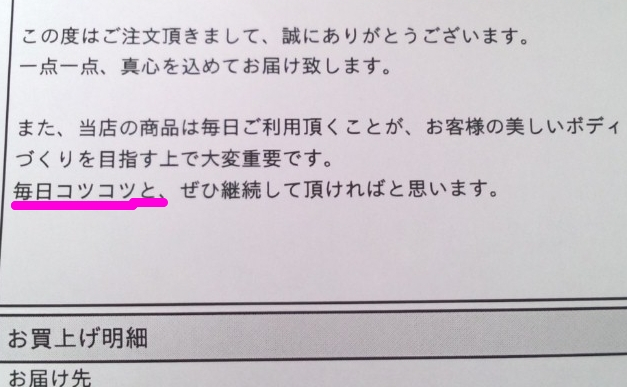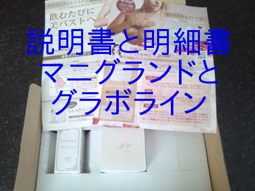 入っていたのは、マニグランド(クリーム)と、グラボライン(サプリメント)と、それぞれの説明書が1枚ずつ、それから、お買い上げ明細書が1枚、でした。
